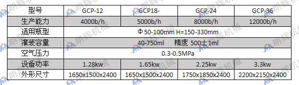 該機主要用于不含氣液體的灌裝,定量準確,調整改變灌裝容量方便,是白酒、藥液等低粘度瓶裝液體的理想設備。