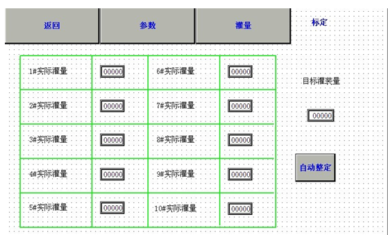 將實際灌量數(shù)值輸入1—10#實際灌量內(nèi)(可以為公斤數(shù)也可以為升數(shù),灌量范圍500ML-11L),再將想灌裝數(shù)值輸入“目標(biāo)灌裝量”,按自動整定,則10個頭的灌裝量都變?yōu)?ldquo;目標(biāo)灌裝量”數(shù)值。